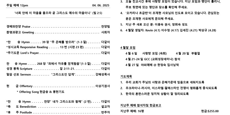 2025년 4월 6일 교회주보 페이지 정보 작성자 : CrownMinistry 작성일 : 2024-11-01 조회수 : 231 목록 본문 2025년 4월 6일 교회주보 이전글2025년 6월 1일 주일 주보 25.06.02 LIST